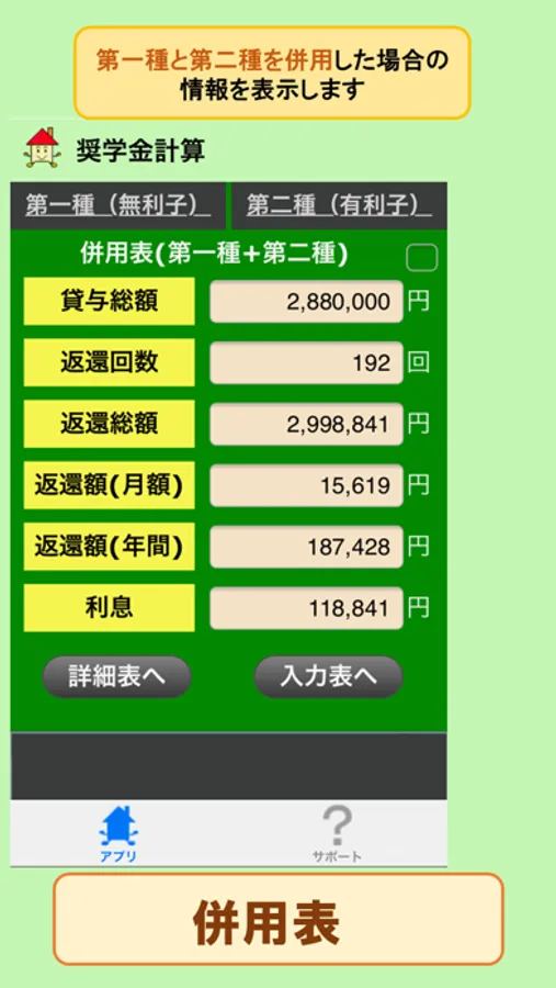 併用した場合の貸与総額・返還回数・返還総額・返還額(月額/年間)・利息を表示します。