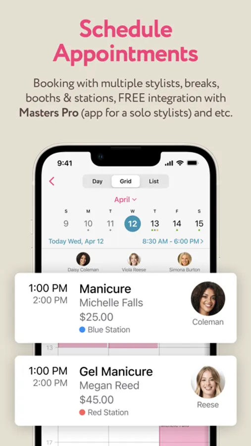 Booking with multiple stylists, booths & stations, breaks, FREE integration with Masters Pro (app for a solo stylist), etc.