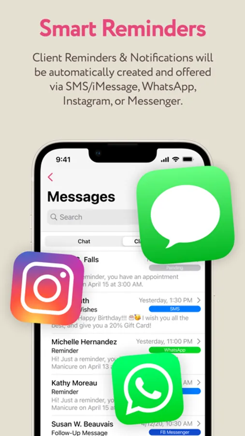 Client Reminders & Notifications will be automatically created and offered via SMS/iMessage, WhatsApp, Telegram, or email.