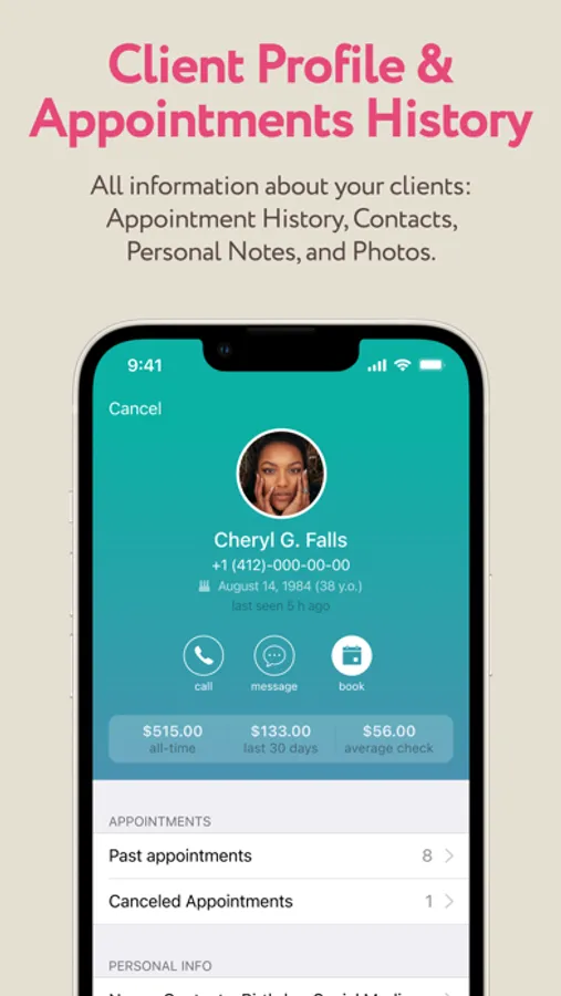 All information about your clients: Appointment History, Contacts, Personal Notes, and Photos.