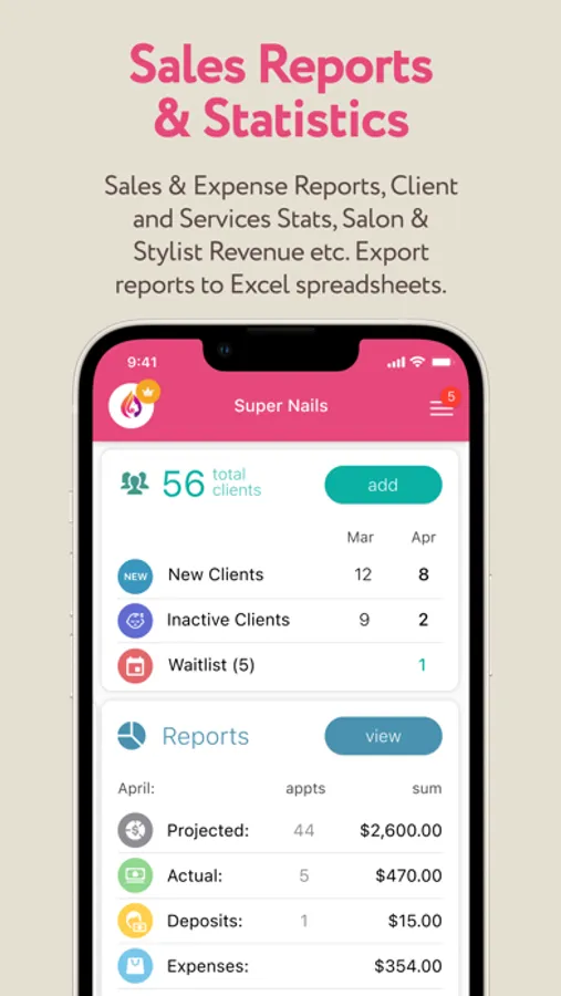 Sales & Expense Reports, Client and Services Stats, etc. Export reports to Excel spreadsheets.