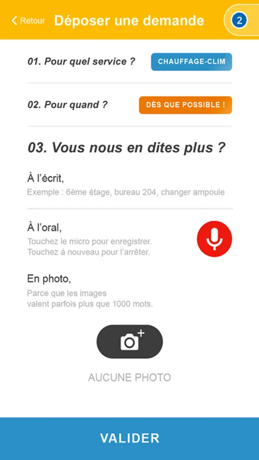 Afin de faciliter la formulation de votre demande, utilisez les champs prédéfinis et décrivez votre demande par un commentaire audio ou texte. Agrémentez le d’une ou plusieurs photos pour donner tous les éléments nécessaires à notre équipe pour une intervention rapide.