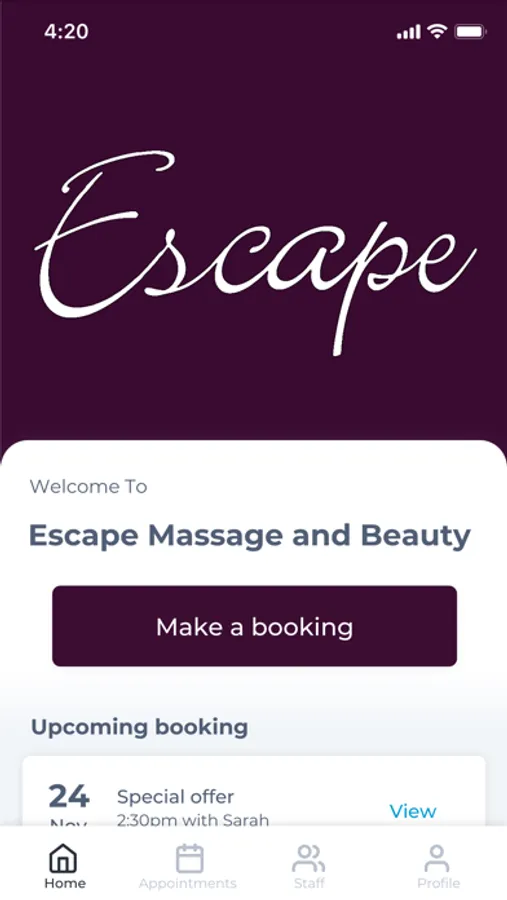 The Escape Massage and Beauty app makes booking your appointments and managing your loyalty points even easier. You're just a few taps away from feeling good and looking great!