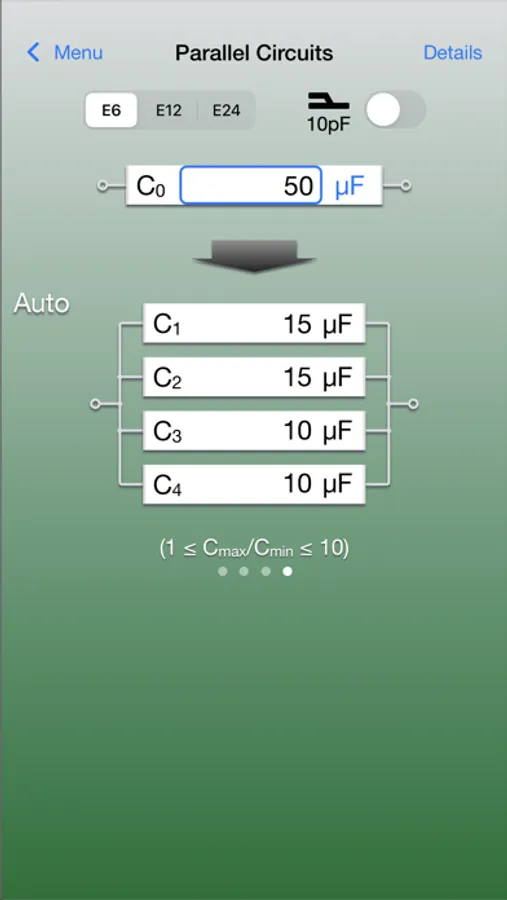 In the Series Circuits and Parallel Circuits, divided capacitance values are calculated in entering a combined capacitance value into an input box.