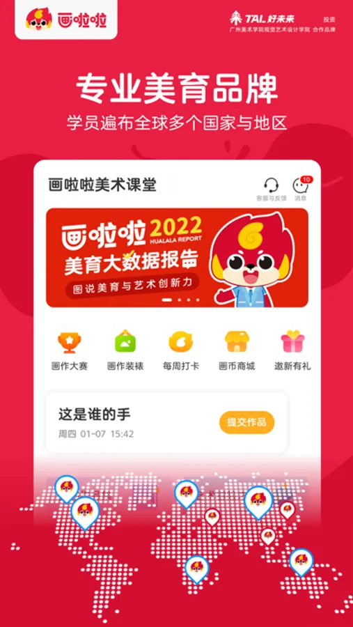 画啦啦是一款用心设计的互联网美术教育产品,孩子的专属创意美术小画堂。