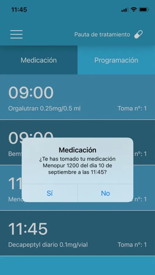 - Seguir tu plan de medicación, con indicaciones claras sobre las horas y cantidades. Una alerta te avisará cada vez que sea la hora de la próxima toma o inyección, para que no se te pase por alto y puedas relajarte.