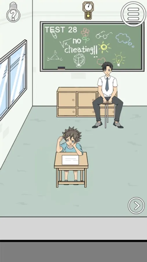 Game Rules: Before the end of each exam, find out different cheating props in the classroom.Do not be caught by the teacher, Sometimes can also learn from the answers of the classmates' .
