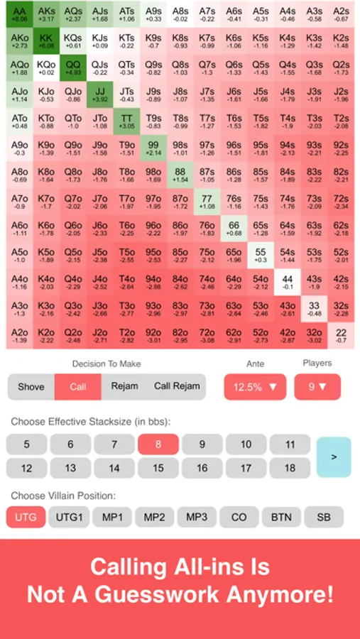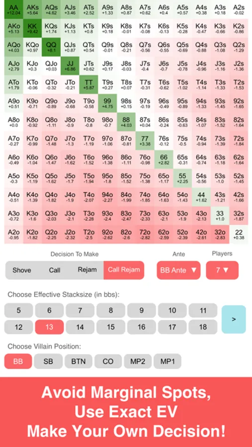 - EV of every single shove and/or call is shown so that you can base your decisions based on EV and avoid those marginal spots as an exploit!