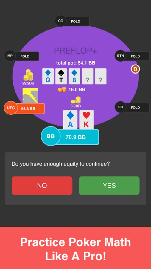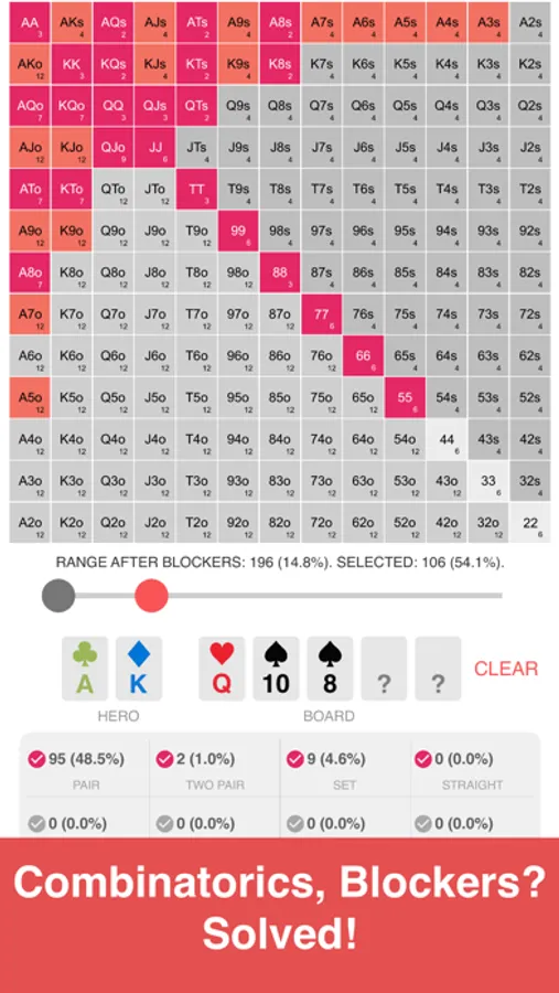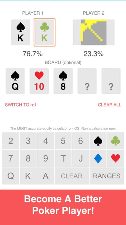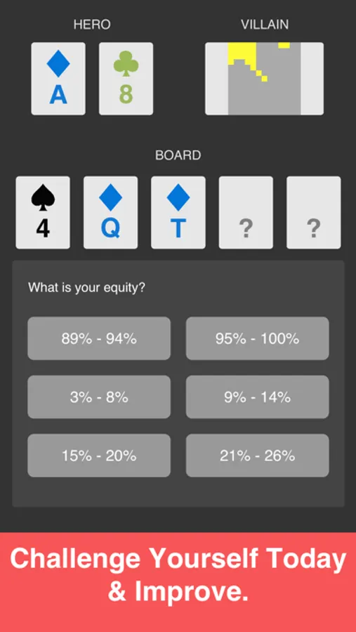 The app also has the fastest and most accurate equity calculator for all streets - Preflop, flop, turn and river.