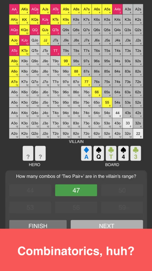We have training modules to train different aspects of Poker. Pot Odds, Equity Drills, Shove/Fold Charts Trainer, Combinatorics are some of the training modules available in app for you to train. Train regularly and become the best poker player, ever!