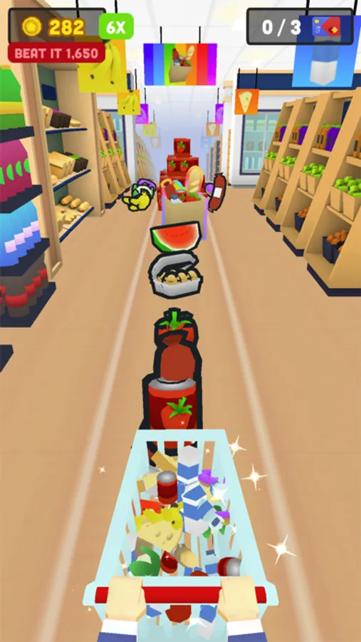 RACE through supermarkets! COLLECT as many groceries as you can! UPGRADE your cart and WIN a spot on the local or global shopping list!