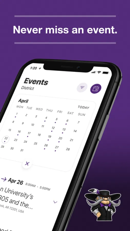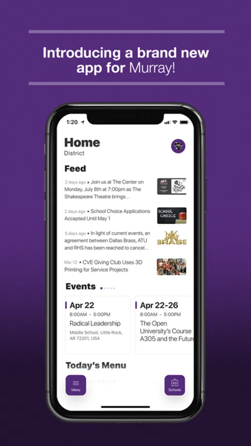 The event section shows a list of events throughout the district. Users can add an event to your calendar to share the event with friends and family with one tap.