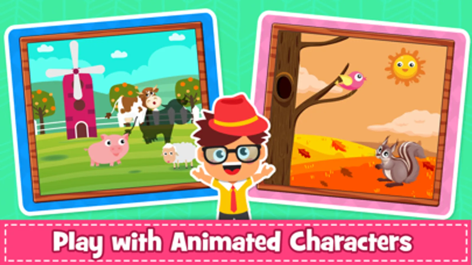 Interactive cartoon animals for children are fun to play almost like real jigsaw puzzles for kids. Toddlers put together puzzle pieces to reveal the cartoon picture in Colorful Puzzle sets (Farm animals, Forest animals, Underwater, Vehicles, Monsters, Dragons, Pirates, Holiday, Farm, Family, Dinosaurs, carnival, Space, Dogs, Fairy Tales, Winter). It has animal games for kids and animal puzzles. A kids puzzles free.