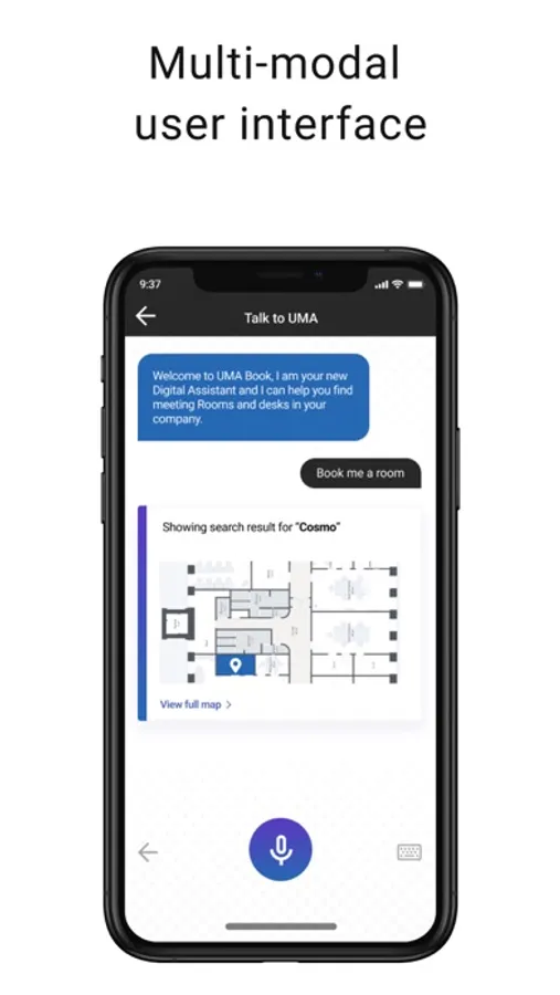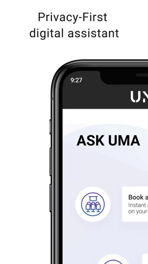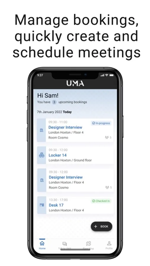 UMA Book is a smart workplace application that allows you to book desks and meeting rooms with the help of our AI smart bot or using an interactive floor plan view of your building.
