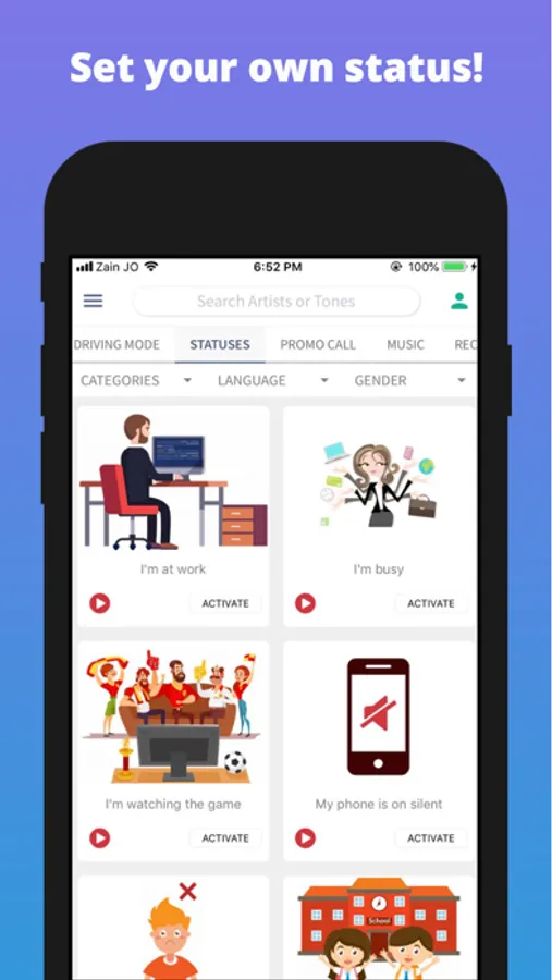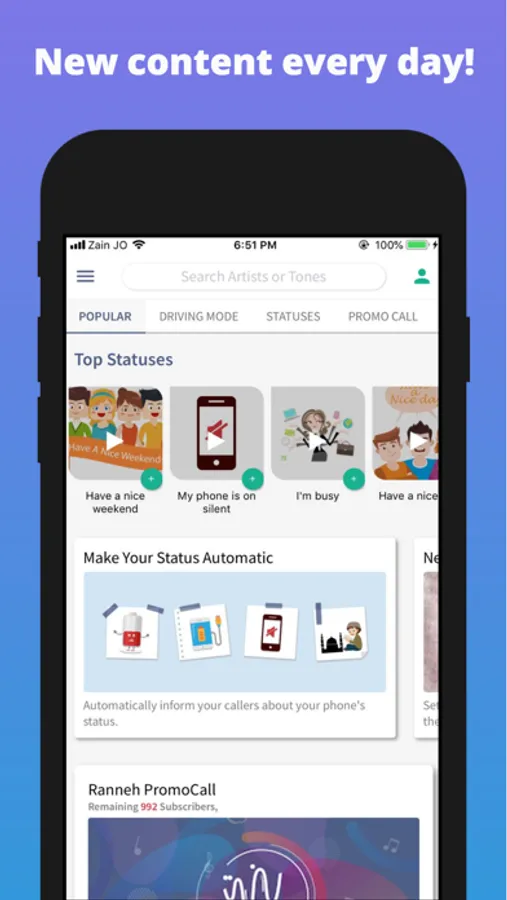Ranneh lets you to express yourself by customizing your ringback tones and entertaining your callers. Set your status to inform callers when you're busy, driving, or at work.