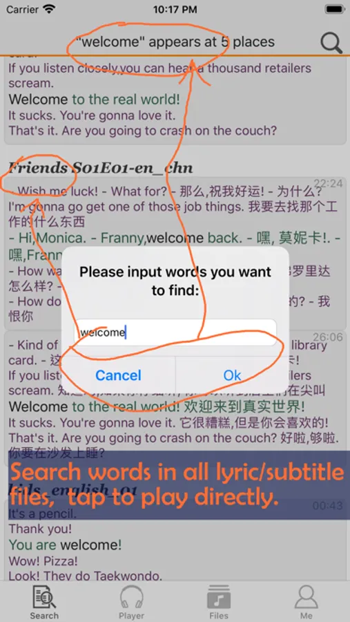 5) Search words/phrase in all lyric/subtitle files.