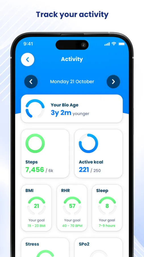 You can connect with Apple HealthKit and other platforms to retrieve your daily steps. The lower your Bio Age against your real age, the better!