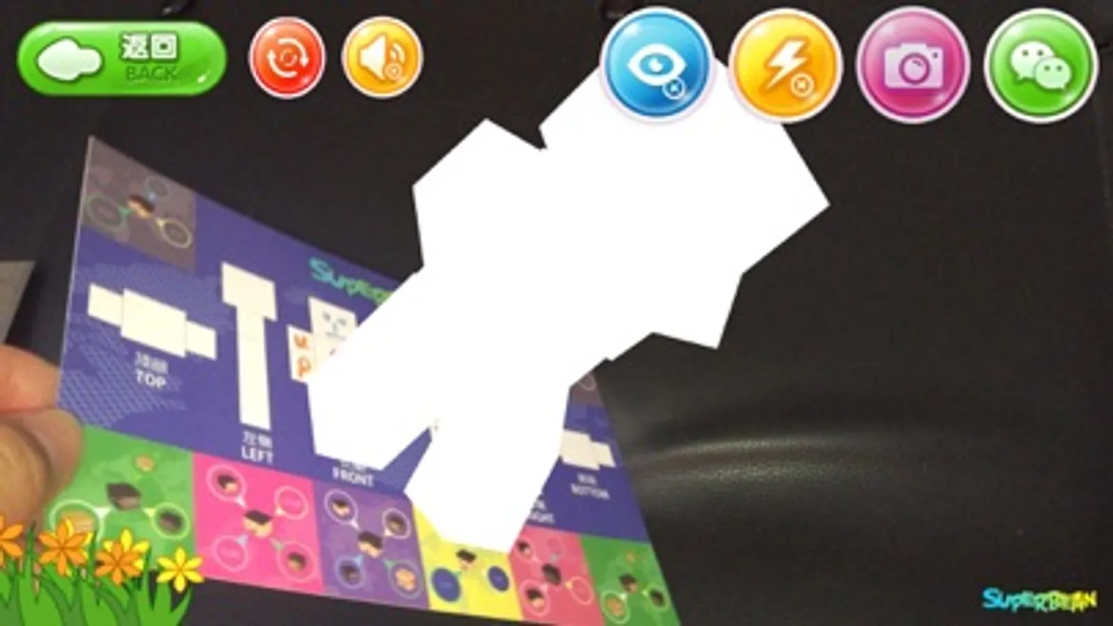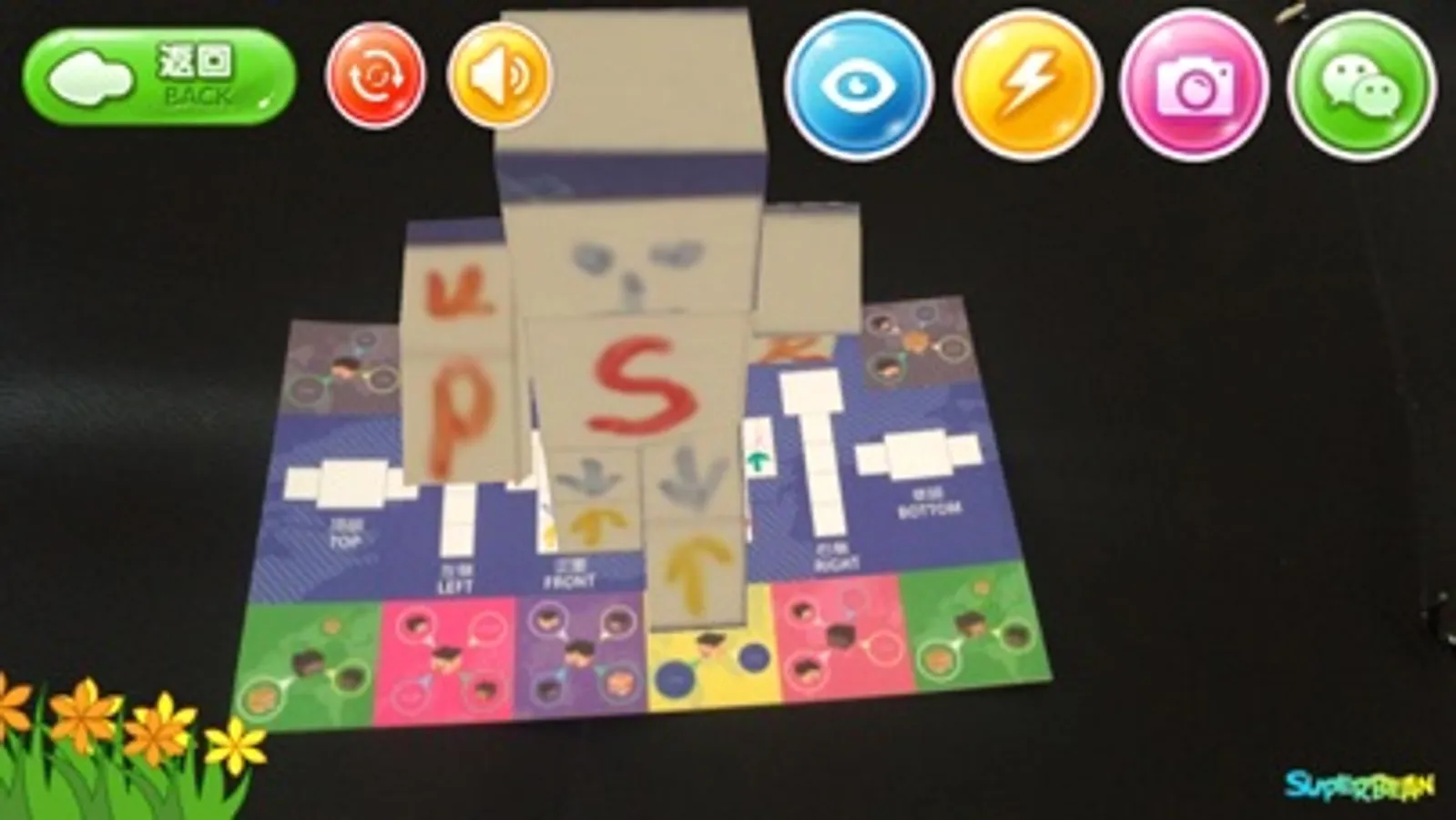 小朋友可以在我们的绘本上用颜色笔随意涂上自己喜欢的颜色或纹路,手机会实时显示立体效果,点击生成按钮后,立体作品便可以将颜色纹路附着在3D立体物体上,这时小朋友可以和自己所创作的立体作品进行互动合影,并将它分享到朋友圈。