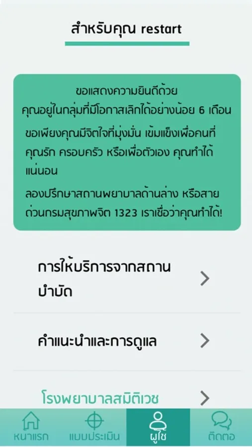 Restart เป็น application ที่ สร้างมาเพื่อเป็นเพื่อน ช่วยบำบัดและเลิกยาเสพติด มอบโอกาสให้มาเริ่มต้นใหม่อีกครั้ง เพราะเราเชื่อว่า ทุกชีิวิตมีคุณค่า ดังนั้น เราจะมอบโอกาสและความหวังดีให้ทุกคน