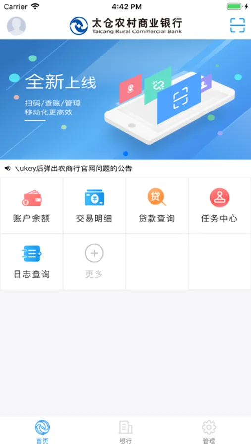 太仓农村商业银行专为企业用户打造的移动金融服务平台,页面简洁、操作流畅,具备账户余额、交易明细、贷款查询、任务中心、日志查询功能。