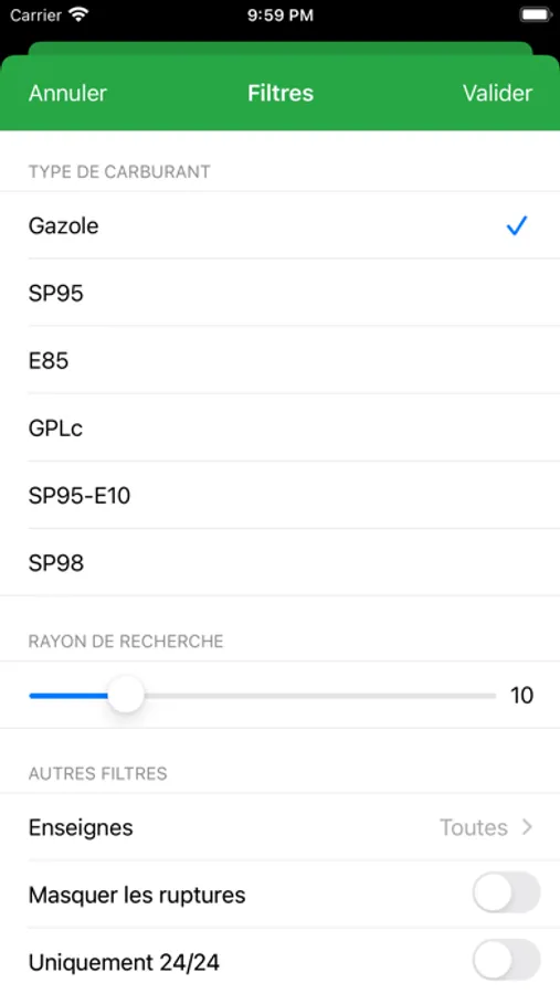 Les filtres (type de carburant (gazole, sp95, e85, gpl, e10, sp98), rayon de recherche, enseignes, masquer les ruptures, uniquement 24/24) vous aideront à identifier les meilleurs prix rapidement.