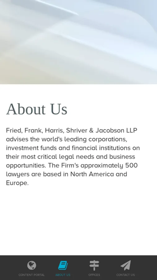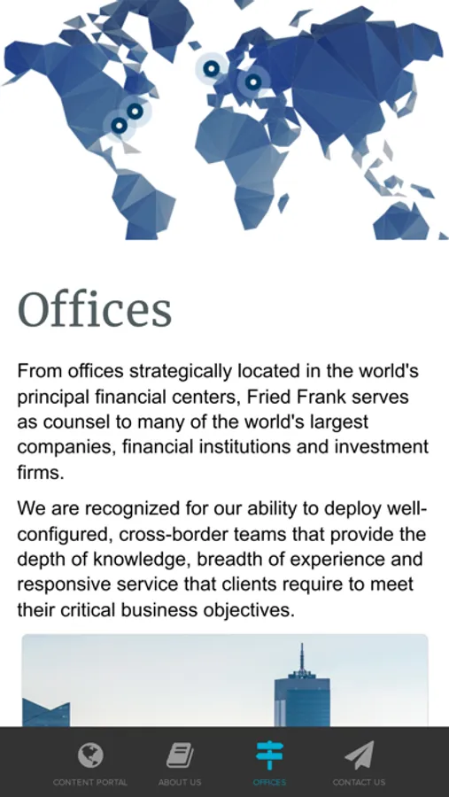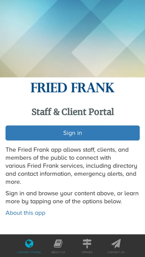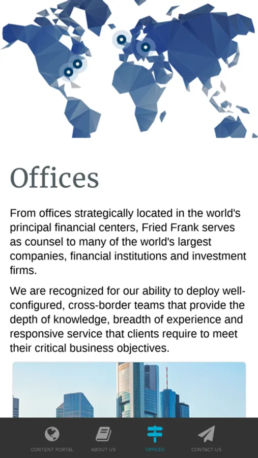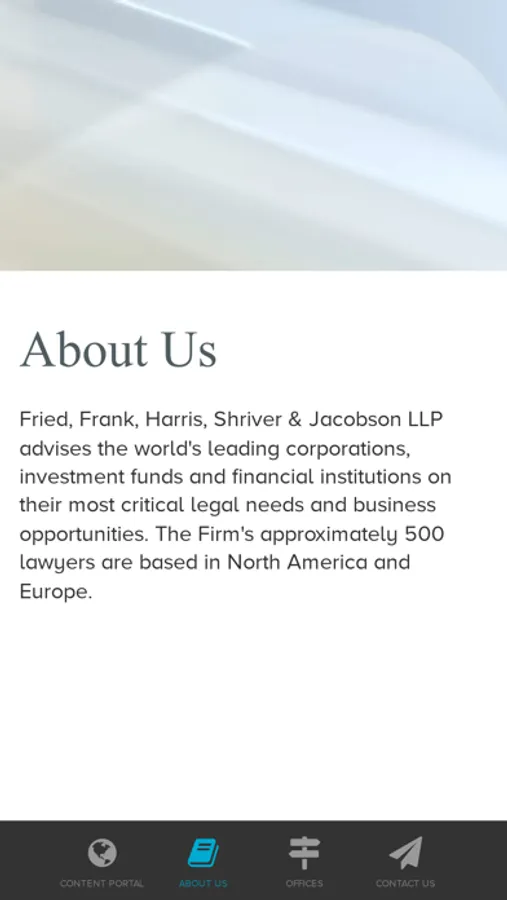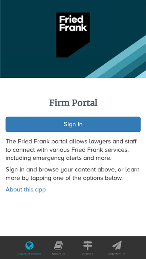 The Fried Frank app allows staff, clients, and members of the public to connect with various Fried Frank services, including directory and contact information, emergency alerts, and more.