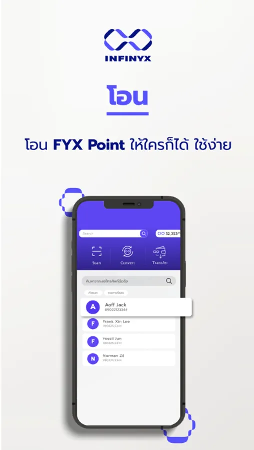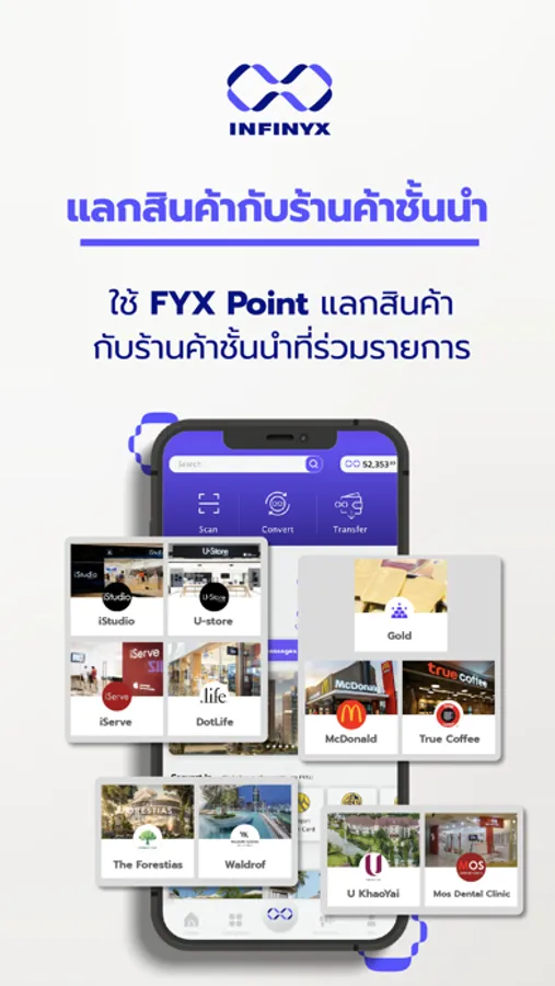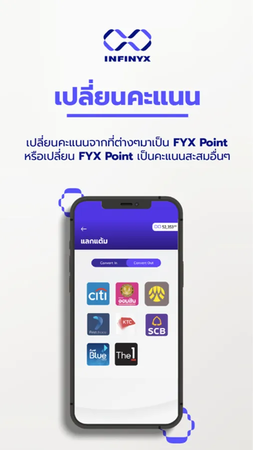 หากคุณไม่รู้ว่าจะใช้คะแนนสะสมที่ได้จากที่ต่างๆ อย่างไร แอป INFINYX ให้คุณนำคะแนนเหล่านั้นมาแลกเป็นคะแนน FYX และนำมาใช้ร่วมกับการใช้จ่ายหรือแลกรับสิทธิประโยชน์ต่างๆ ผ่านแอป INFINYX