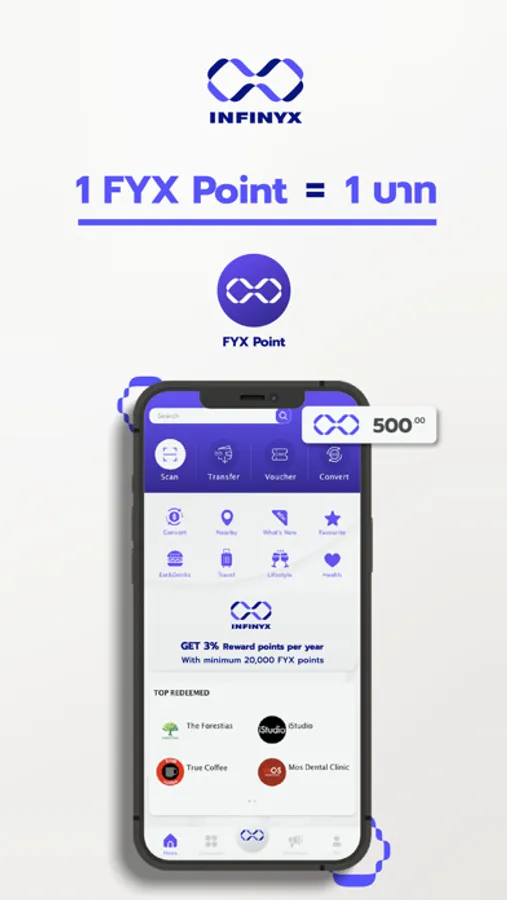 มูลค่าของคะแนนในแอป INFINYX คือ 1 คะแนน FYX = 1 บาท นั่นหมายถึงยิ่งคุณโอนคะแนนสะสมเข้ามาในแอป INFINYX มากขึ้นเท่าใด คุณจะมีคะแนนที่จะใช้เป็นส่วนลด และช่วยคุณประหยัดเงินในกระเป๋ามากยิ่งขึ้น