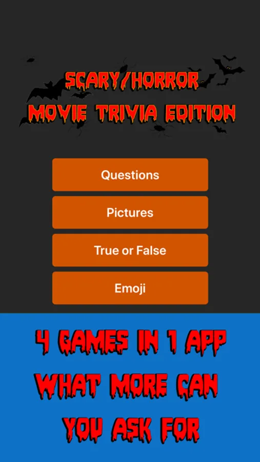 Do you like watching scary and horror movie? This game is for you. This come with 4 games into 1 app. There are multiple choice answer, guessing the picture of the movie, true or false about the movie and scary emoji. This game feature over 150+ trivia questions to keep you entertain.