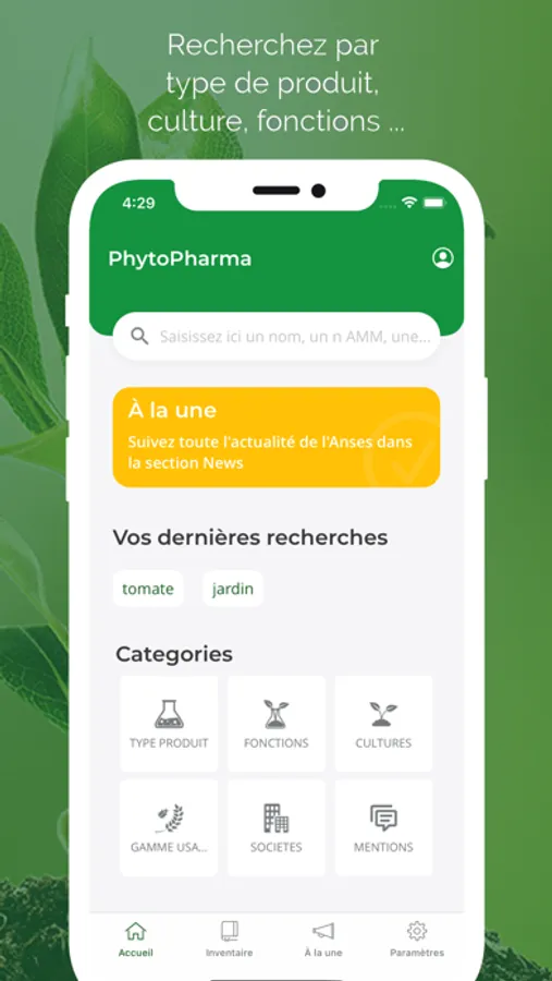 PhytoPharma a été pensé pour les agriculteurs pro et amateurs. L'application permet l'accès à l'ensemble des données des produits (produits phytopharmaceutiques, matières fertilisantes et supports de cultures, adjuvants, produits mixtes et mélanges) couverts par une Autorisation de Mise sur le Marché (AMM).