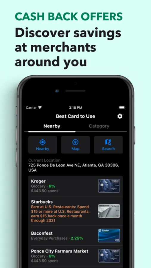 • Intelligently recommends Best Card for nearby merchants so you never miss an opportunity to earn