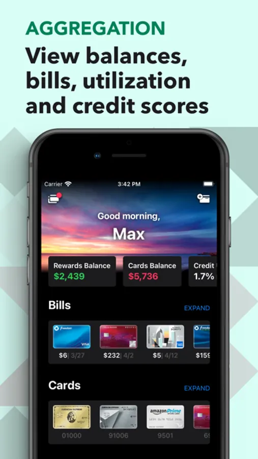 • Provides a comprehensive view of your rewards, cashback offers, current balances, credit limits, credit score performance, and credit utilization