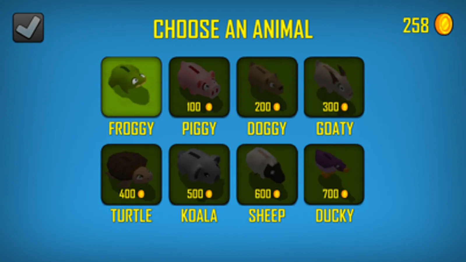 You start with Froggy, but you can change to Piggy, Doggy, Goaty, Turtle, Koala, Sheep, Ducky when you collect enough coins.