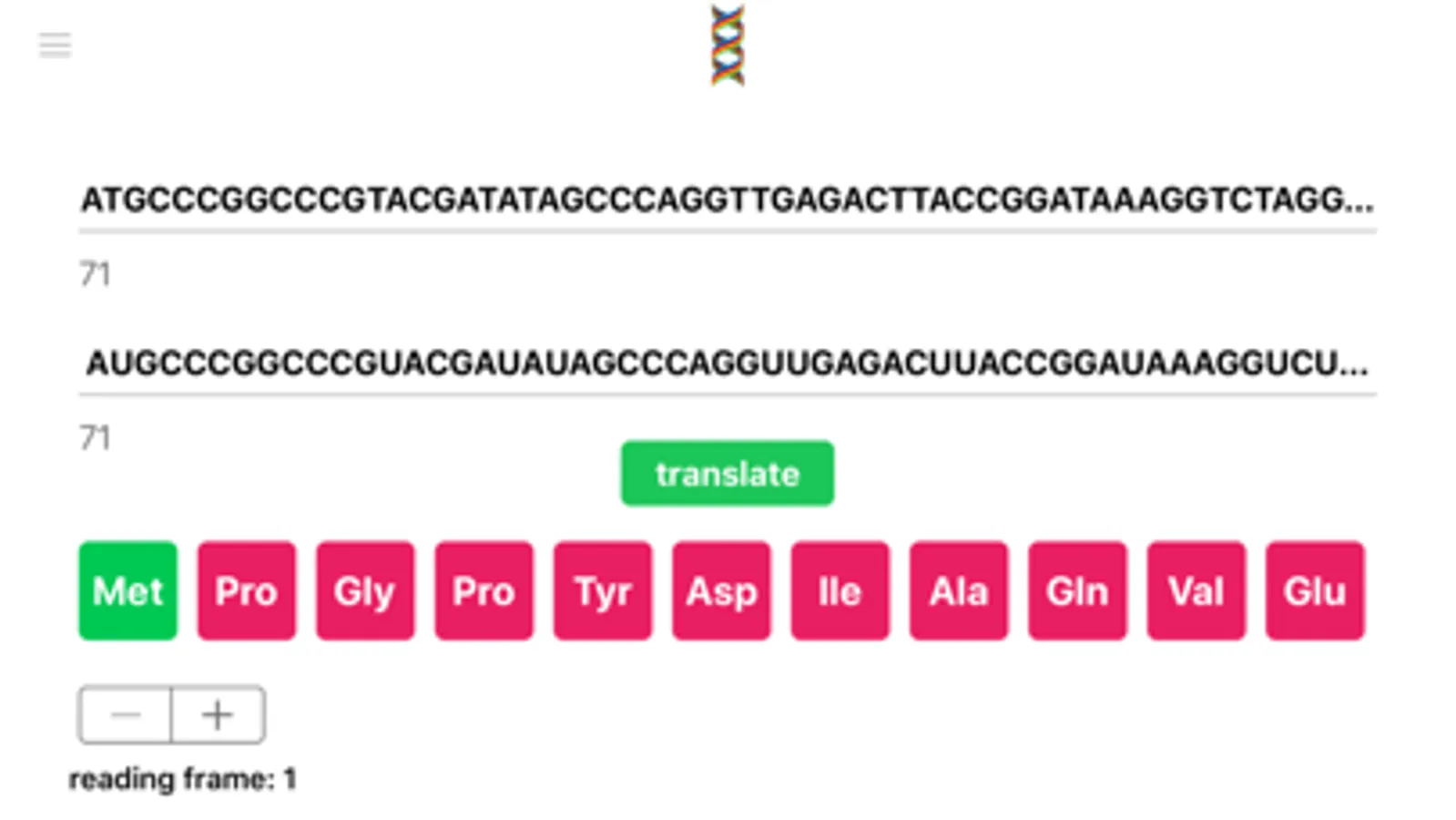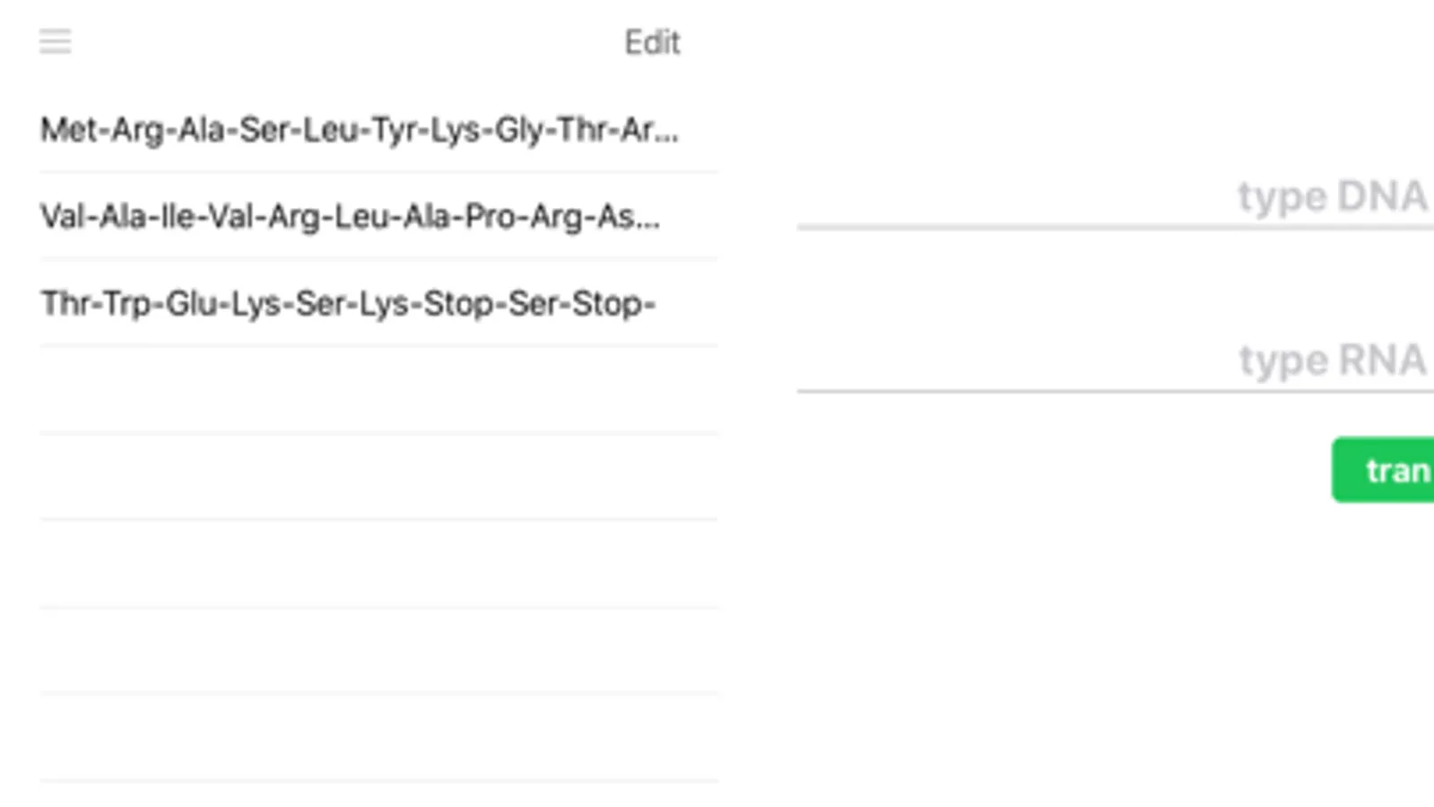 Have the ability to transcribe and translate nucleotide sequences into polypeptide chains. Click and see single/three letter amino acid codes in 3 different reading frames. All of your past translations will be saved so you can go back and edit them anytime.