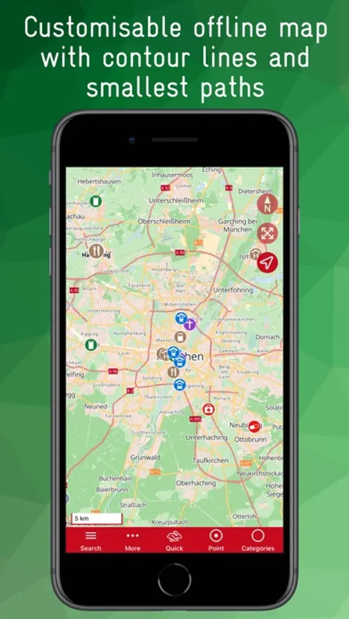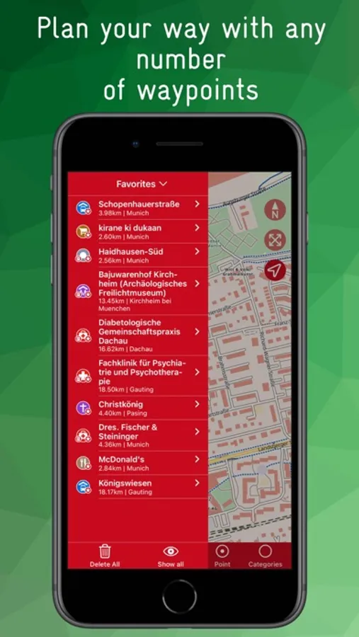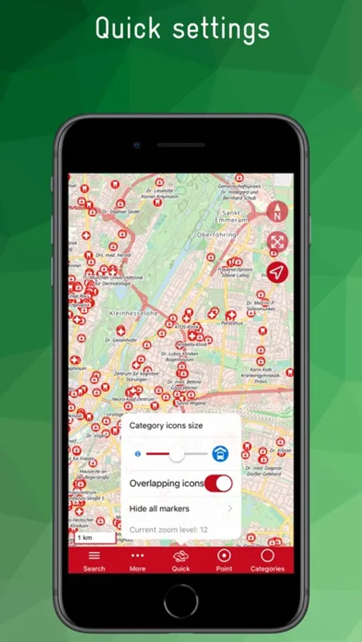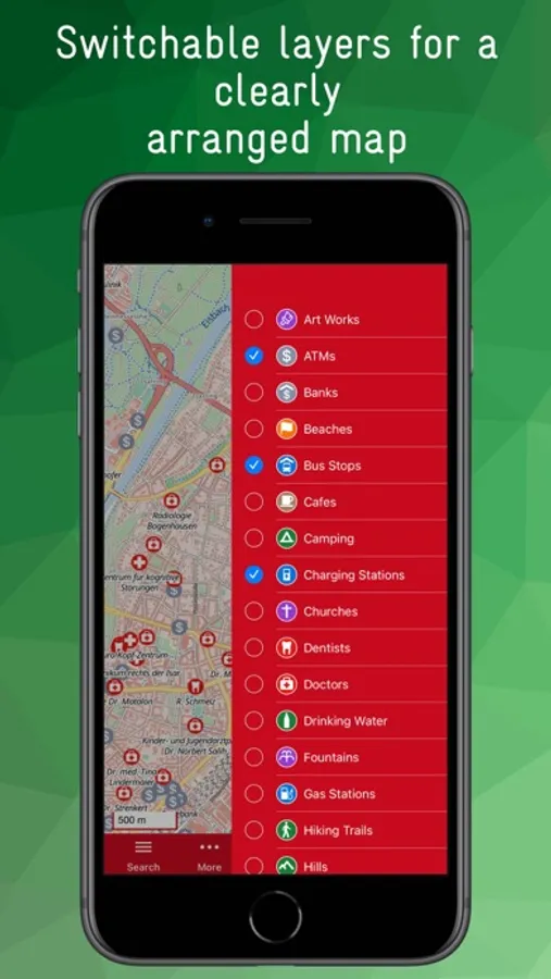 POIs are grouped into categories and can be displayed as layers. For example, you can display all restaurants, public transport lines, banks, hiking trails, charging stations and doctors on the map. The size and overlap of the icons can be adjusted to improve clarity.