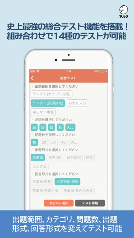 ・ 出題範囲、出題形式、回答形式などの組み合わせで最大14種のテストが可能です