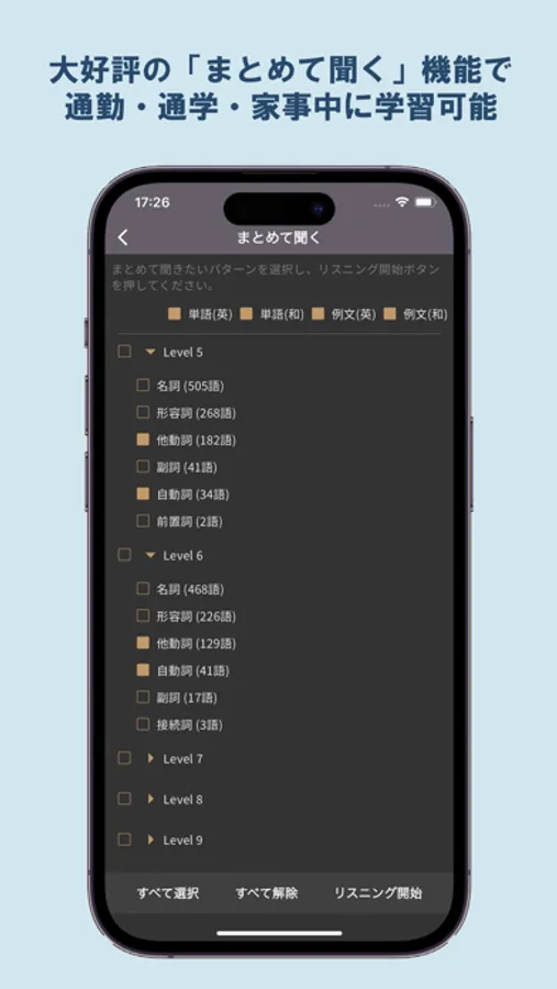 ・ 通勤・通学中にも単熟語が学習できる「まとめて聞く」機能を搭載