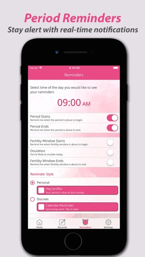 The app also offers custom reminder features. You can set reminders for the start of the period, end of the period, start of the fertility window, ovulation day, end of the fertility window, and contraceptive pills. The discreet reminders feature makes sure that you're never embarrassed in public.