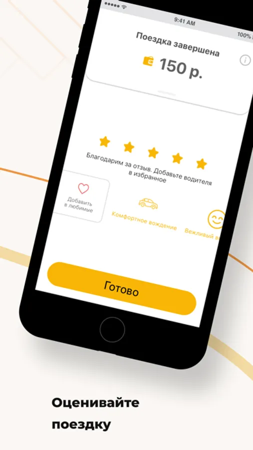 Оценивайте поездку с помощью готовых шаблонов. Занесите водителя в “Избранные”, если понравилась поездка..