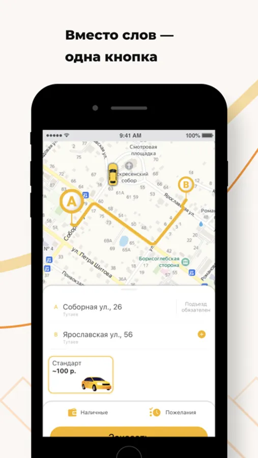Откройте приложение, укажите адрес и закажите такси, нажав на одну кнопку.