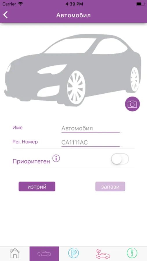 2. Автомобили – В това меню има възможност всеки един потребител да си запамети предпочитани автомобили. След като вече създаде собствен автомобил има опция да избере „Приоритетен“. Този автомобил, ще излиза на първо място в меню „Паркиране“, при наличието на повече от един запаметен такъв.