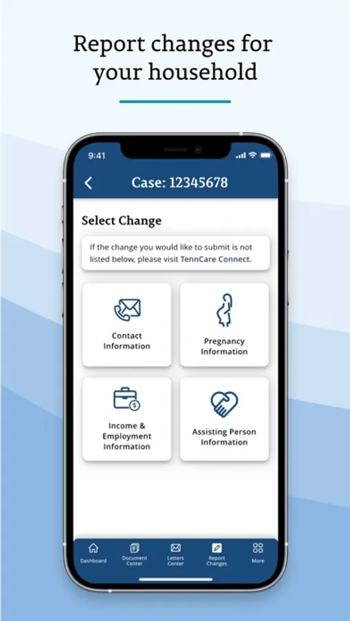 Manage and view your cases anytime you want – right from your phone. You can use the TennCare Connect app to check the status of your case, review your health plan information, view your letters, or send us a photo of required documents. If eligible, you can update your contact information, add/update pregnancy records, and add/update your assisting person. You can also add/update your household’s employment income, self-employment income, or other income (not from a job).