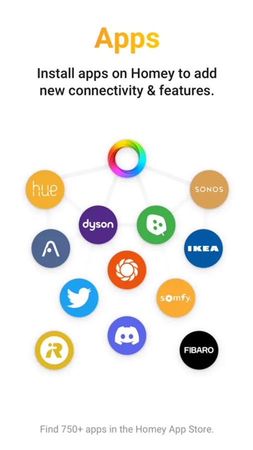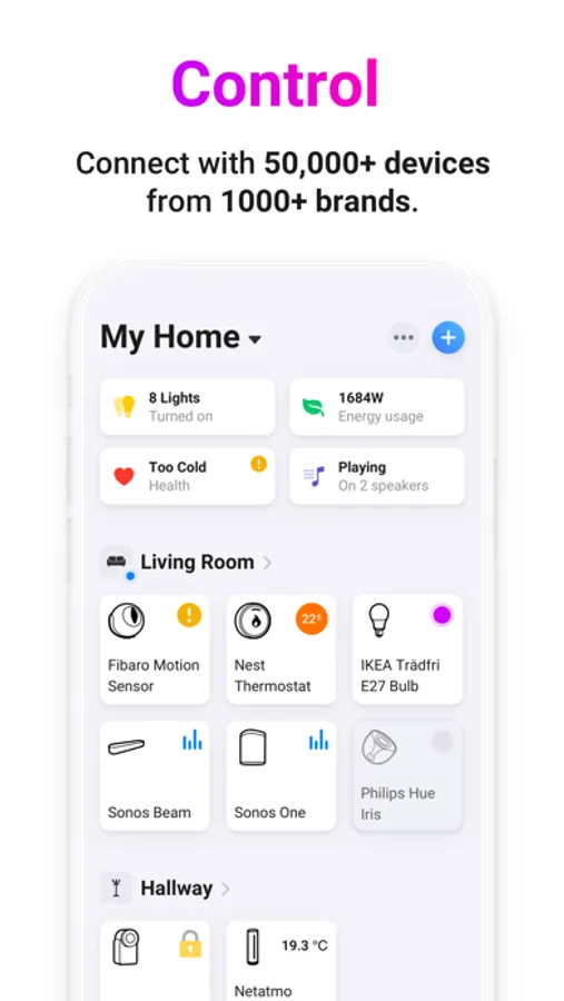 Homey connects more than 50.000 smart devices from over 1000 brands. Make them work together in the way you want. Homey features great-looking controls for all devices, no matter the brand. Make it a joy to play with your smart home.