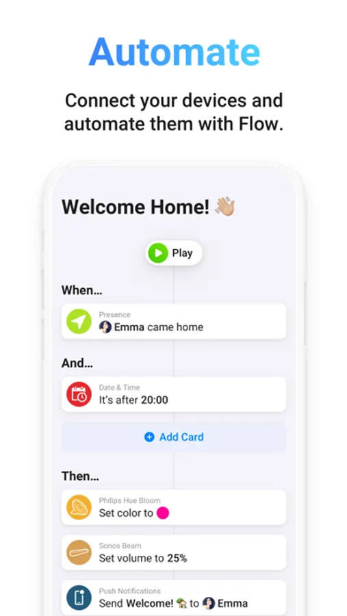 Home automation becomes easier than ever with Homey Flow. Create automations that combine your devices, internet services and music. Anyone can create a Flow with a few taps.