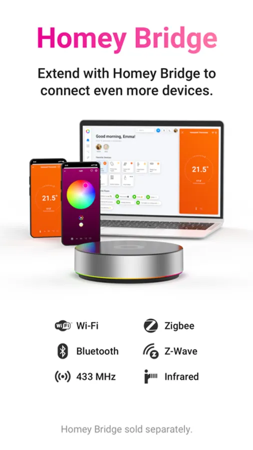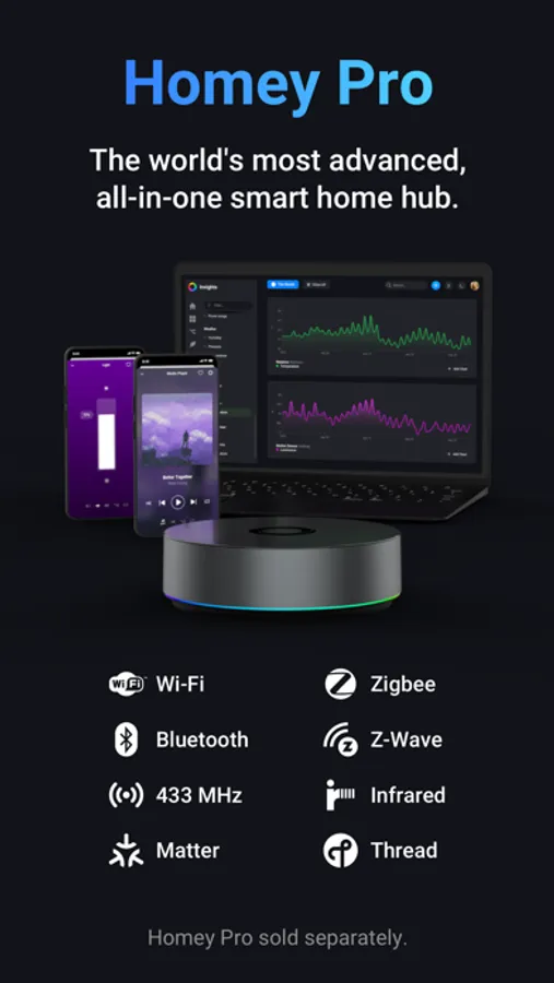 Creating a better smart home has never been easier. Log in, create a home and connect your devices – for free! Cloud-connected devices can be added directly to the Homey app, without the need of a hub. To connect devices using Zigbee, Z-Wave, BLE, 433MHz, Infrared or other local technologies, you can either link Homey Bridge or use Homey Pro.