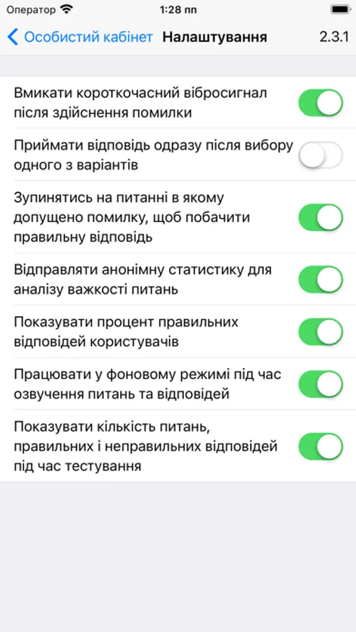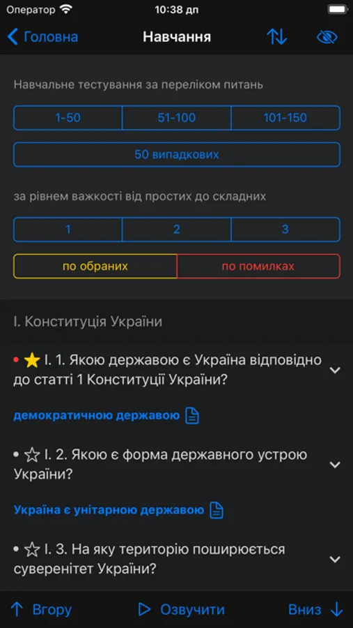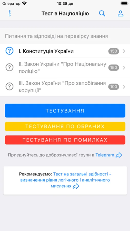 - Тестування по питанняx будь-яких обраних розділів: підряд, випадково або за важкістю (визначається за статистикою проходження тестів усіма користувачами додатку);