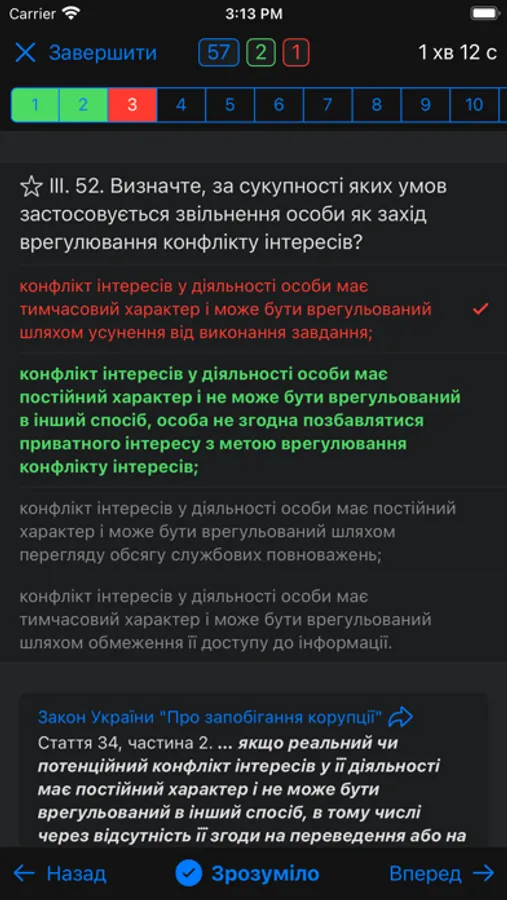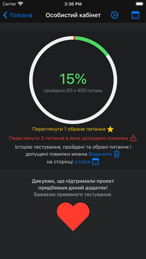 - Можливість додавання питань в "обрані" та проходження по них окремого тестування;