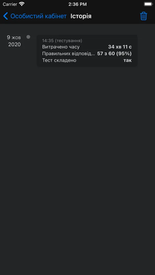 - Випадкове і пропорційне формування пробного тесту з 60 питань (за принципом офіційного іспиту);
