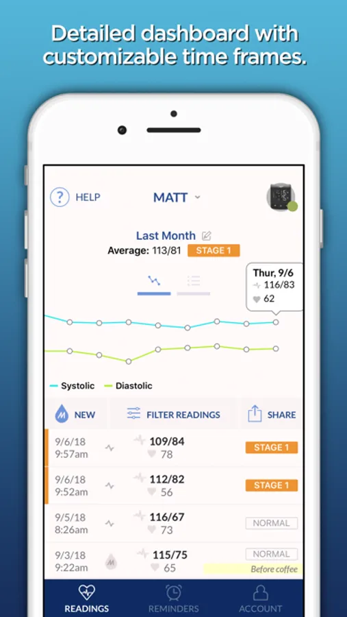 •Detailed dashboard with filtering allows you to customize your profile so you can monitor your readings through easy-to-decipher charts and information.