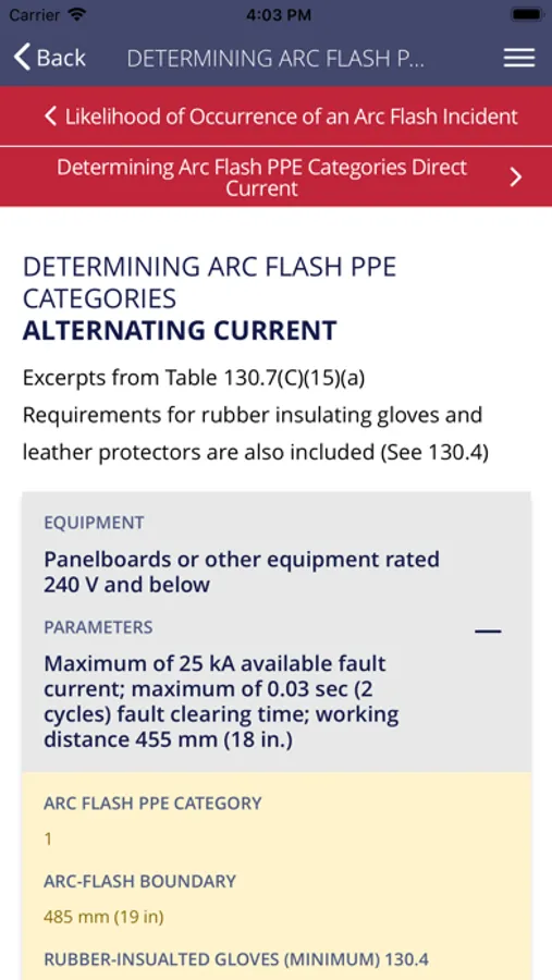 The app provides a simplified approach and understanding to jobsite PPE requirements by providing an in-app job task analysis, briefings examples and risk assessment tools with detailed requirement explanations. The app also provides users with Arc Flash PPE categories, glove charts, and specific PPE options for both direct and alternating current requirements.